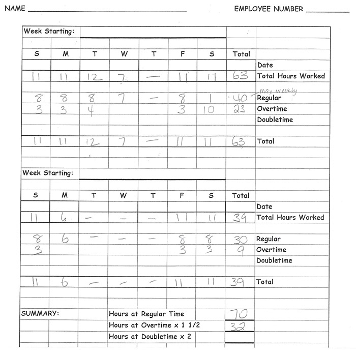 Let me show you an example. I've created two fictious weeks of work, for a company that normally works 4&1 shifts, to show you how overtime is calculated. The exact dates don't matter, but in this example I've used dates in February, because even a coastal vet can be affected by this. The pay period runs from a Sunday morning until a Saturday evening, 14 days in total.
