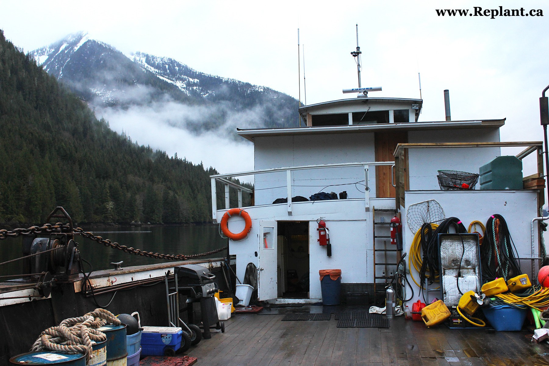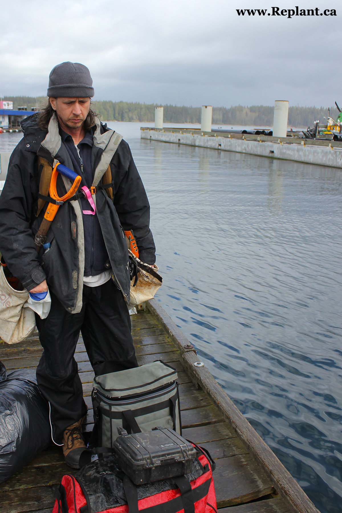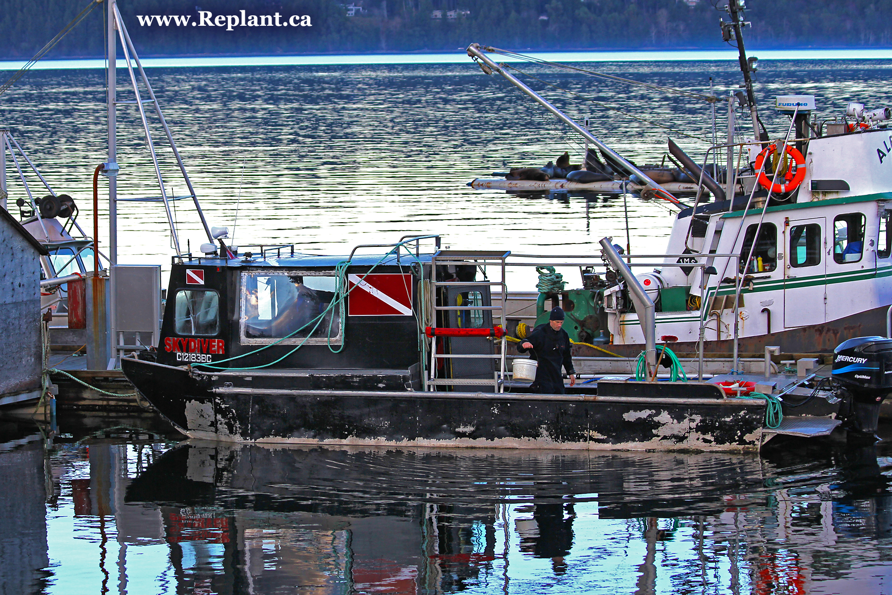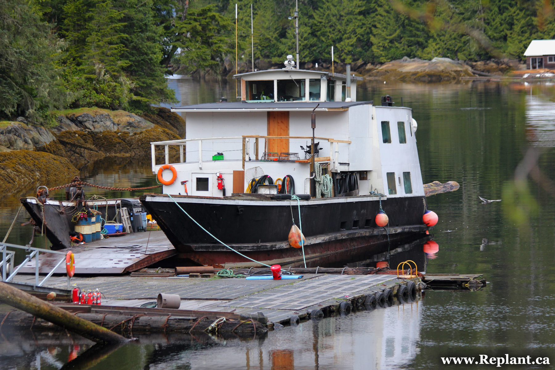 The foreman always gets to do the fun stuff. Jordan had to tie the boat up and swim to shore after dropping all the planters off on the shore, since the old dock had collapsed. The North Pacific water would have made for a rather refreshing swim at that time of year.
