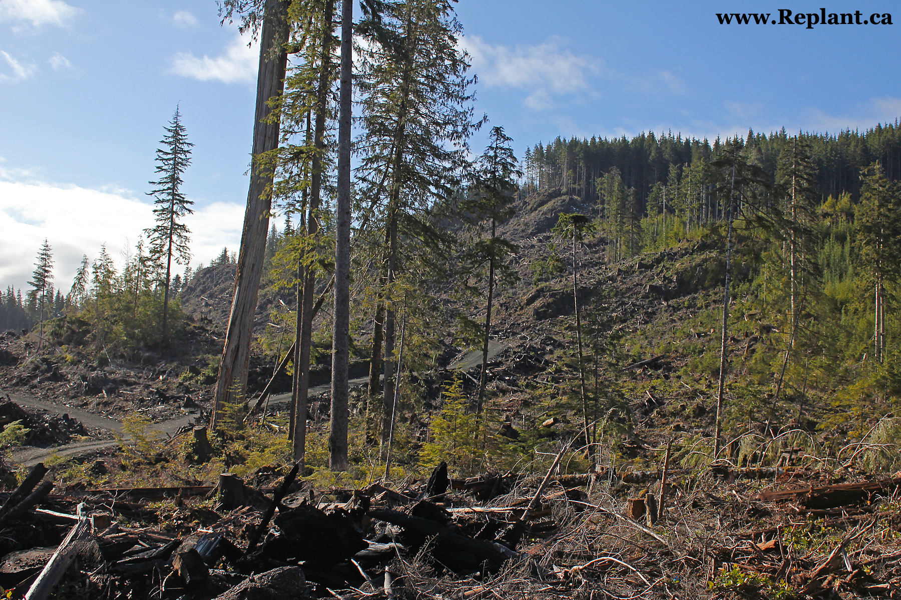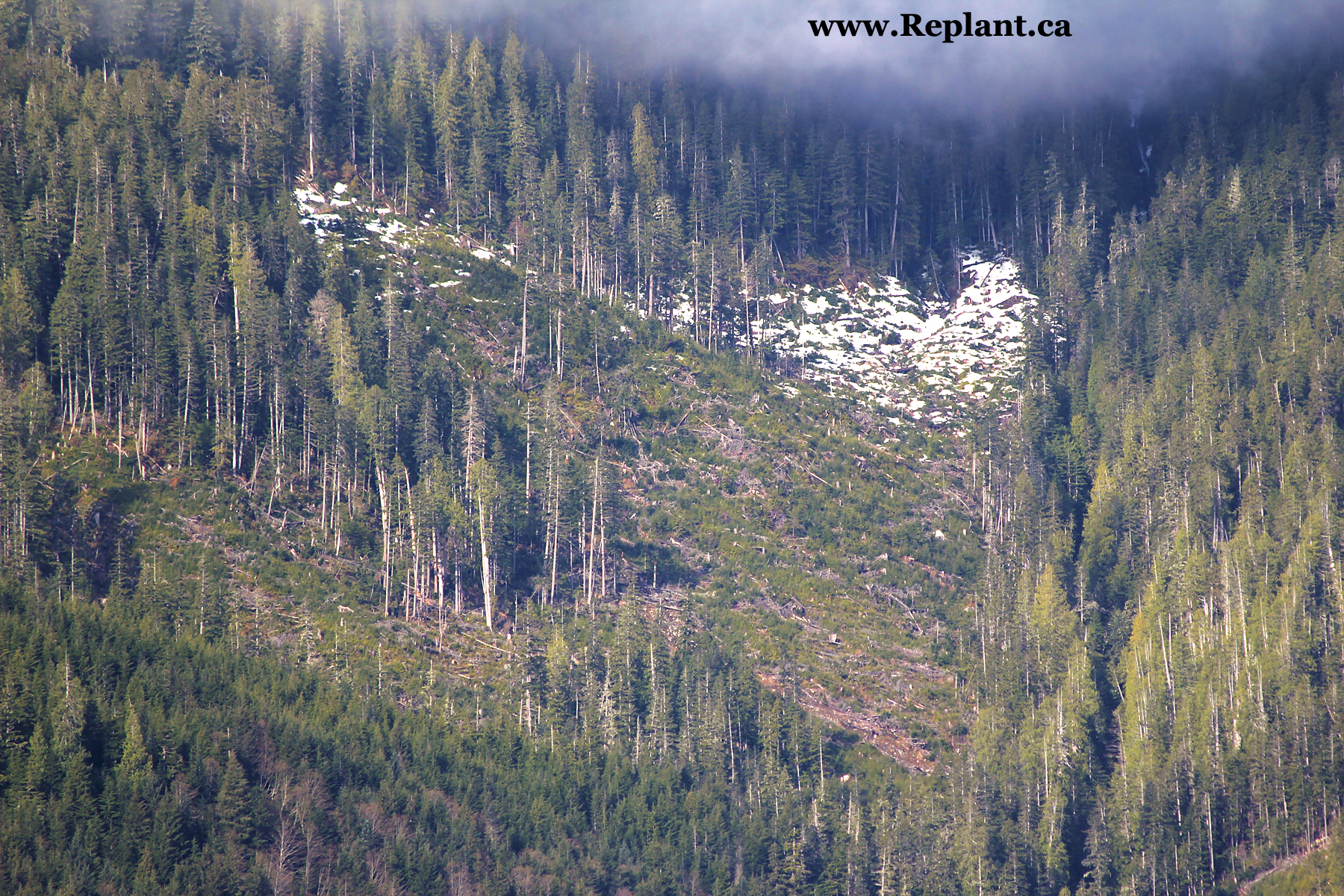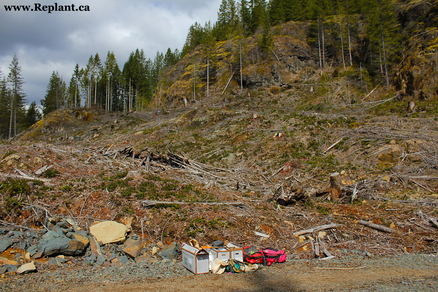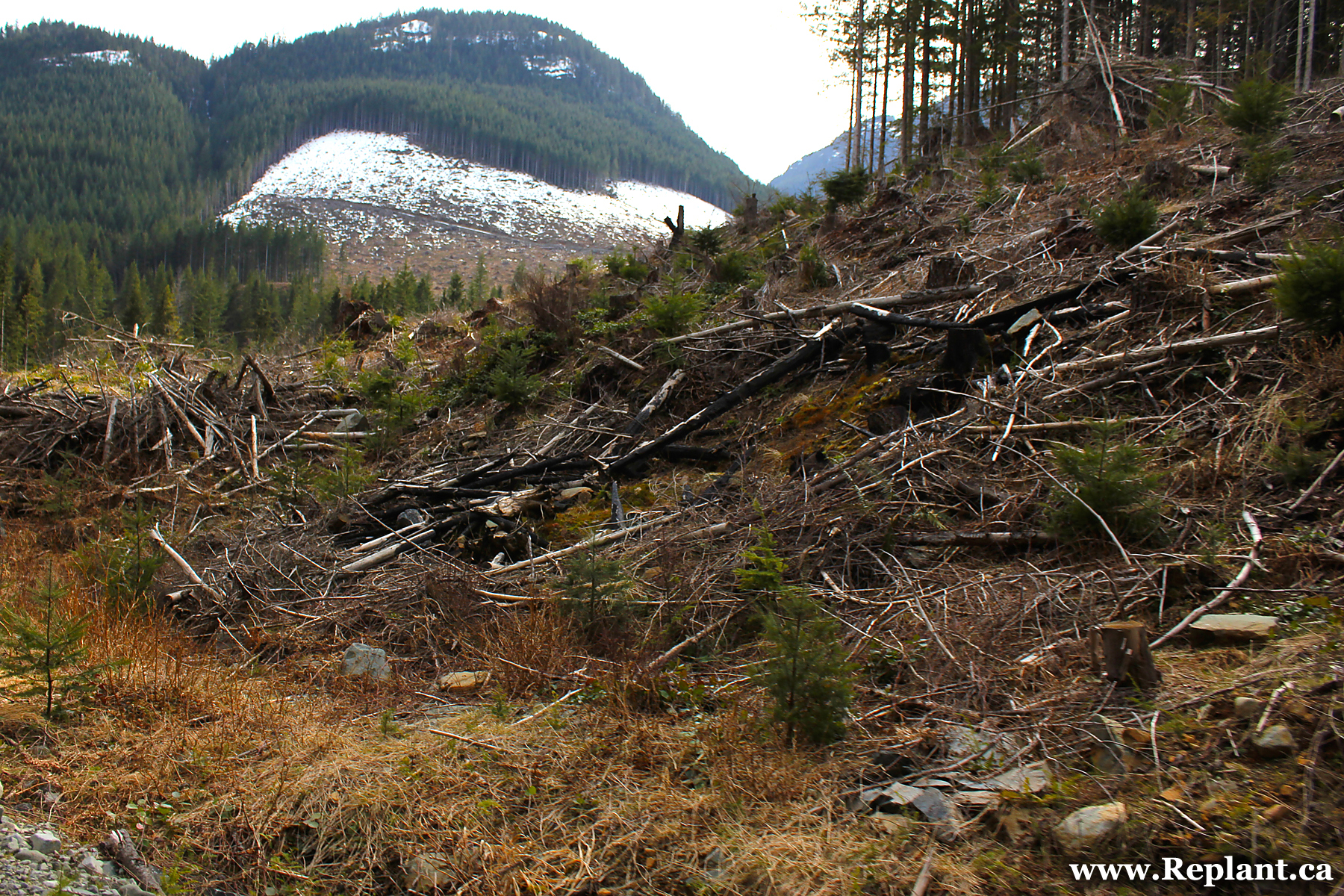 A close-up of one of my pieces. This little piece was particularly ugly, especially in the slash pile in the lower half of the photo. Some of the openings in the slash were 12-14 feet deep, which I'd have to climb down into in order to plant one or two trees. For perspective, the grey stump on the side of the hill, just right of the center of the photo, is about five feet across.