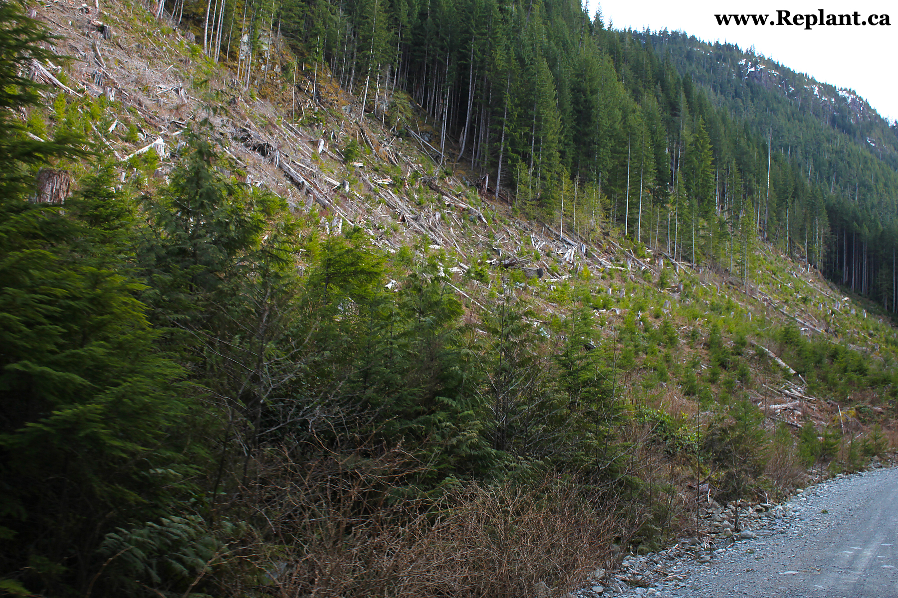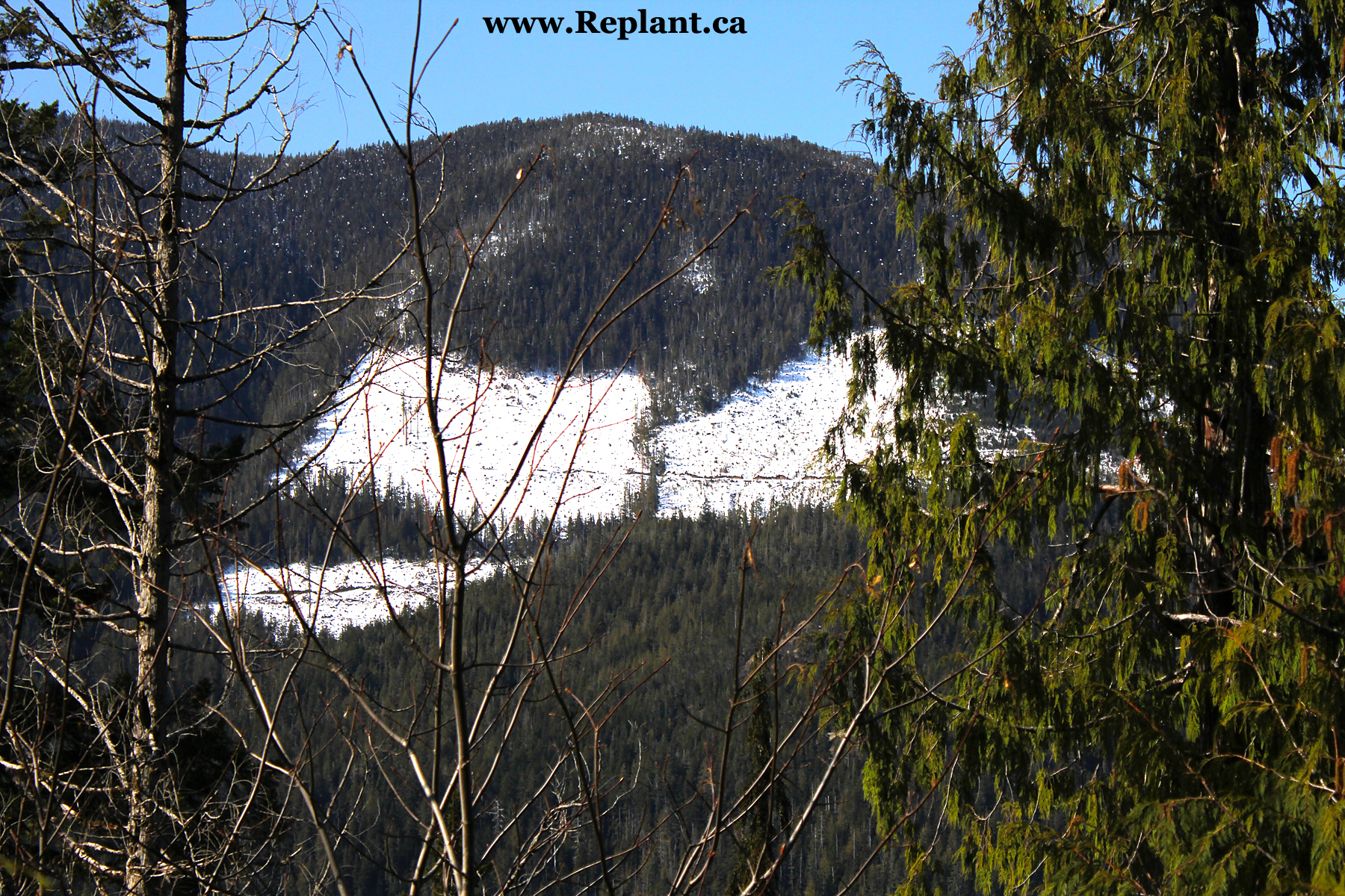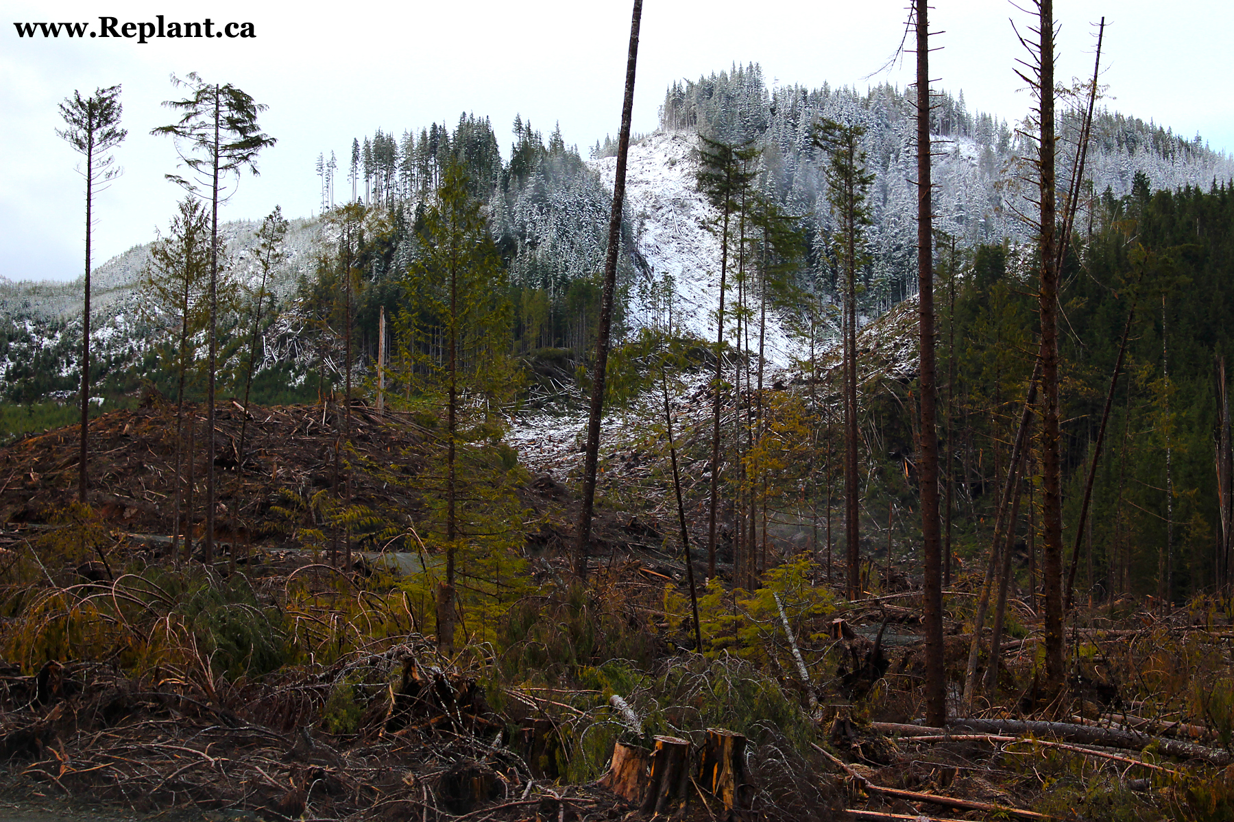 A close-up of one of my pieces. This little piece was particularly ugly, especially in the slash pile in the lower half of the photo. Some of the openings in the slash were 12-14 feet deep, which I'd have to climb down into in order to plant one or two trees. For perspective, the grey stump on the side of the hill, just right of the center of the photo, is about five feet across.