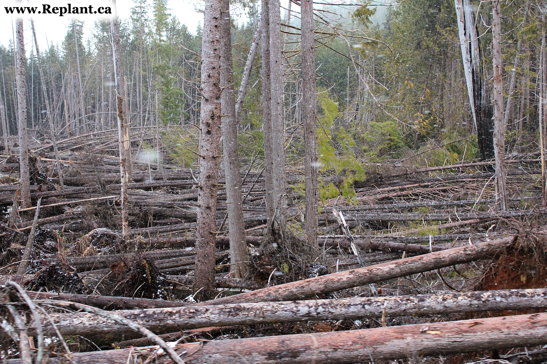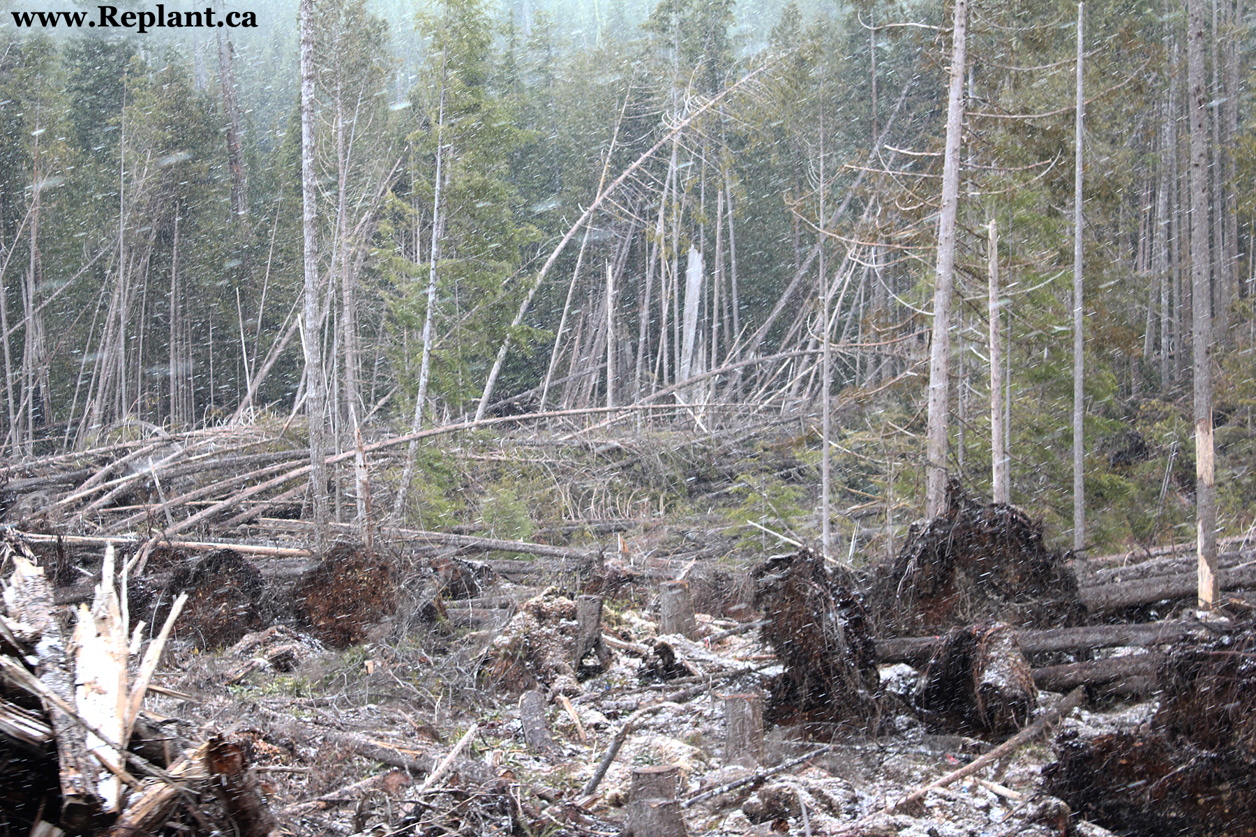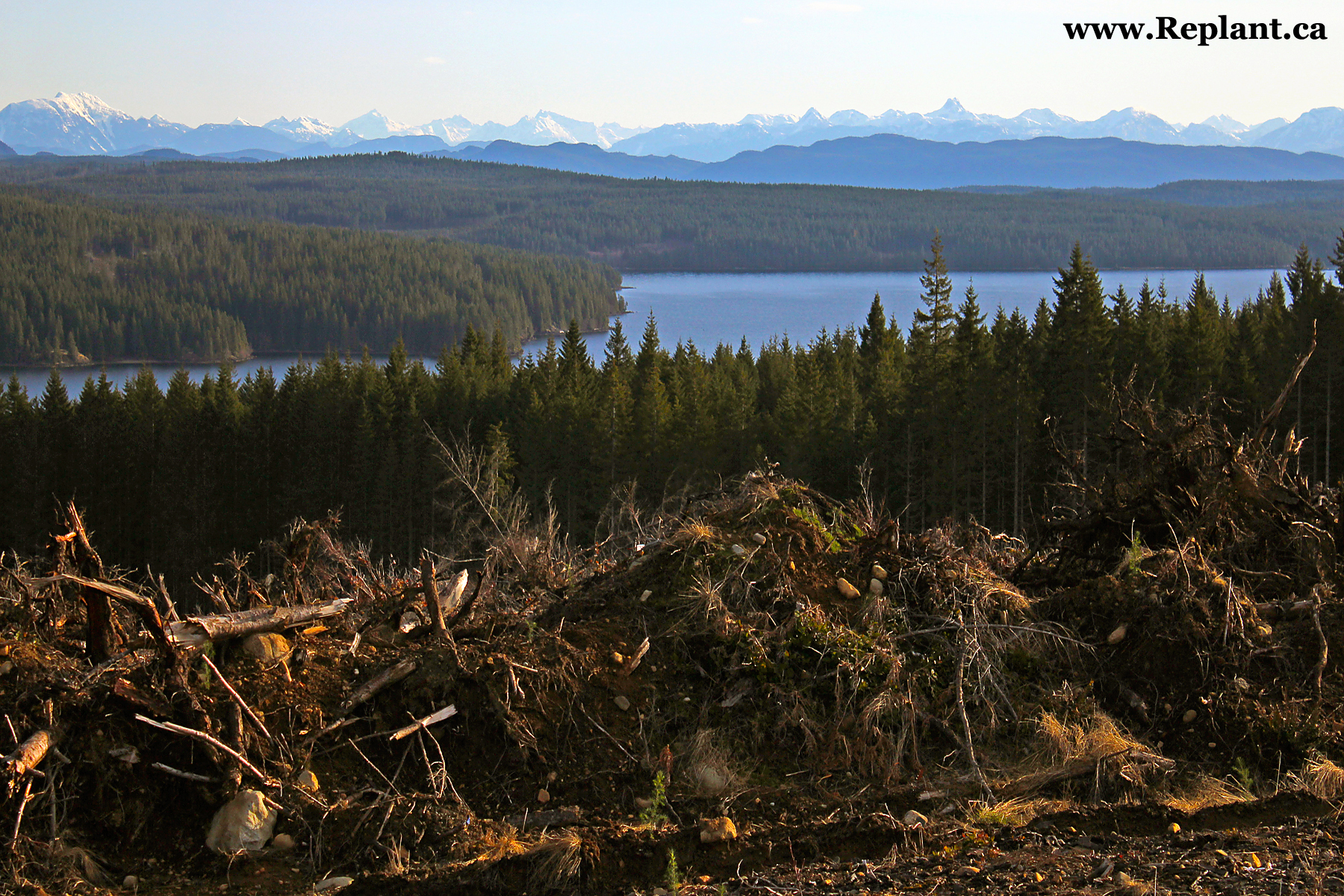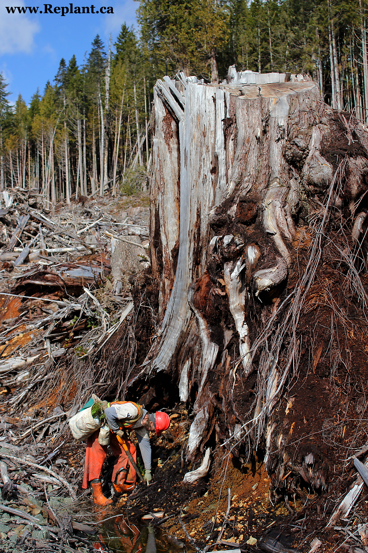 A close-up of one of my pieces. This little piece was particularly ugly, especially in the slash pile in the lower half of the photo. Some of the openings in the slash were 12-14 feet deep, which I'd have to climb down into in order to plant one or two trees. For perspective, the grey stump on the side of the hill, just right of the center of the photo, is about five feet across.