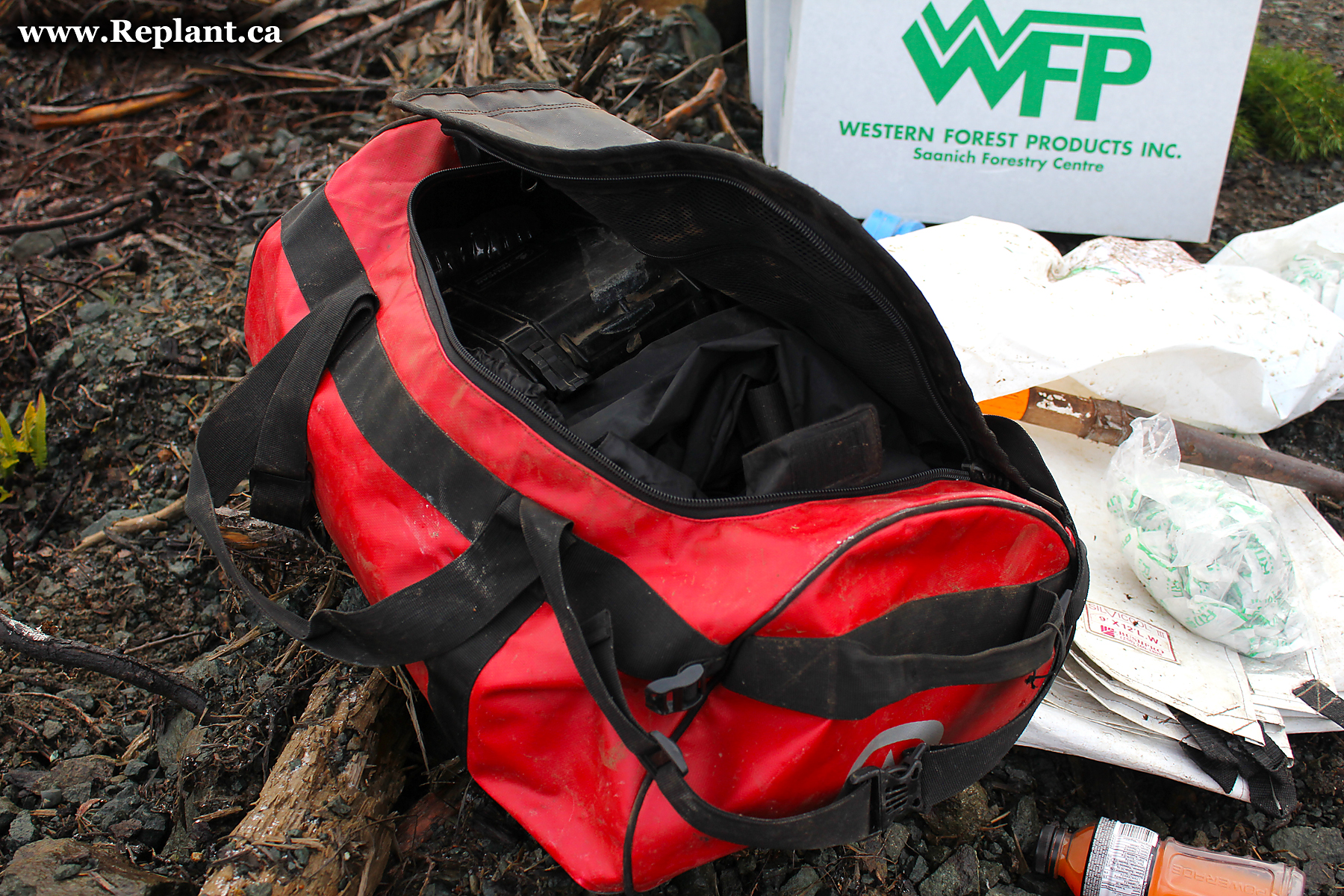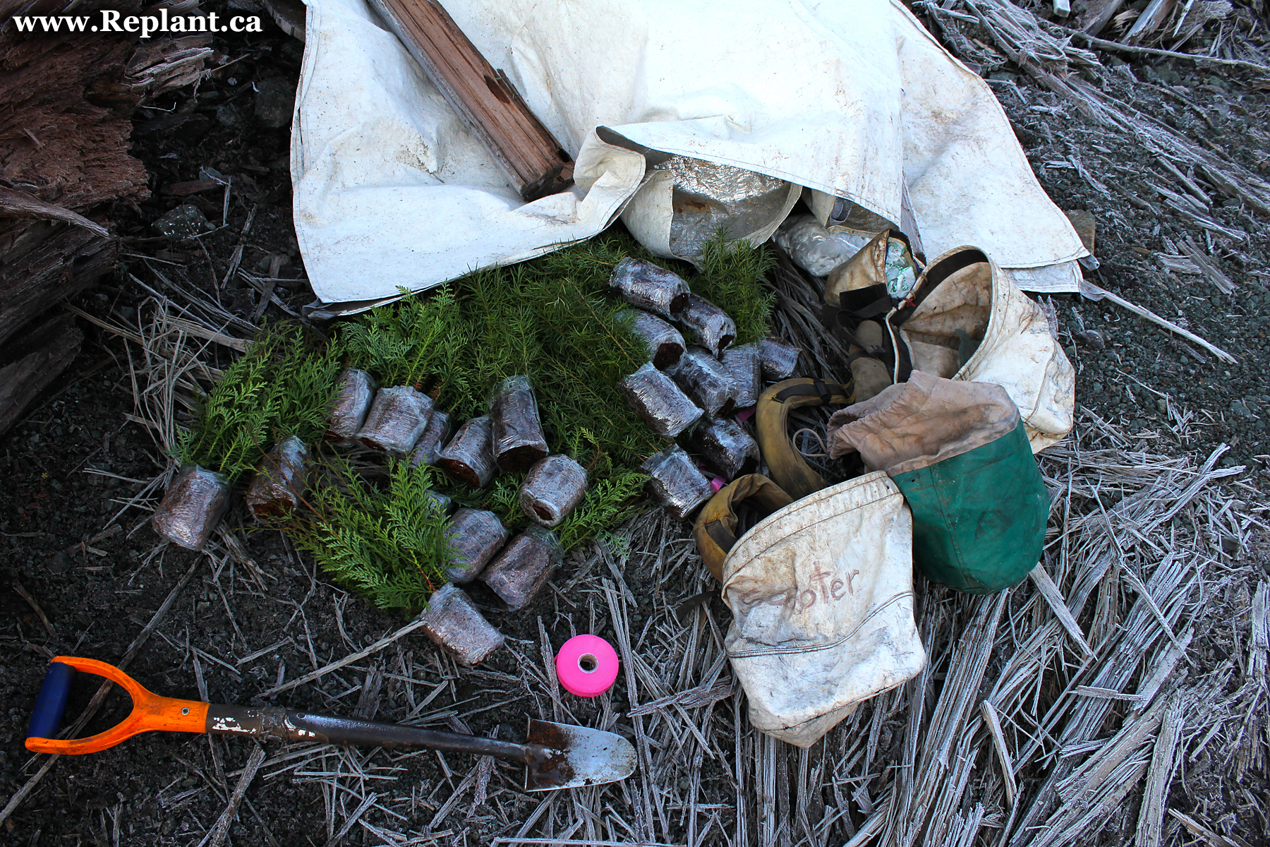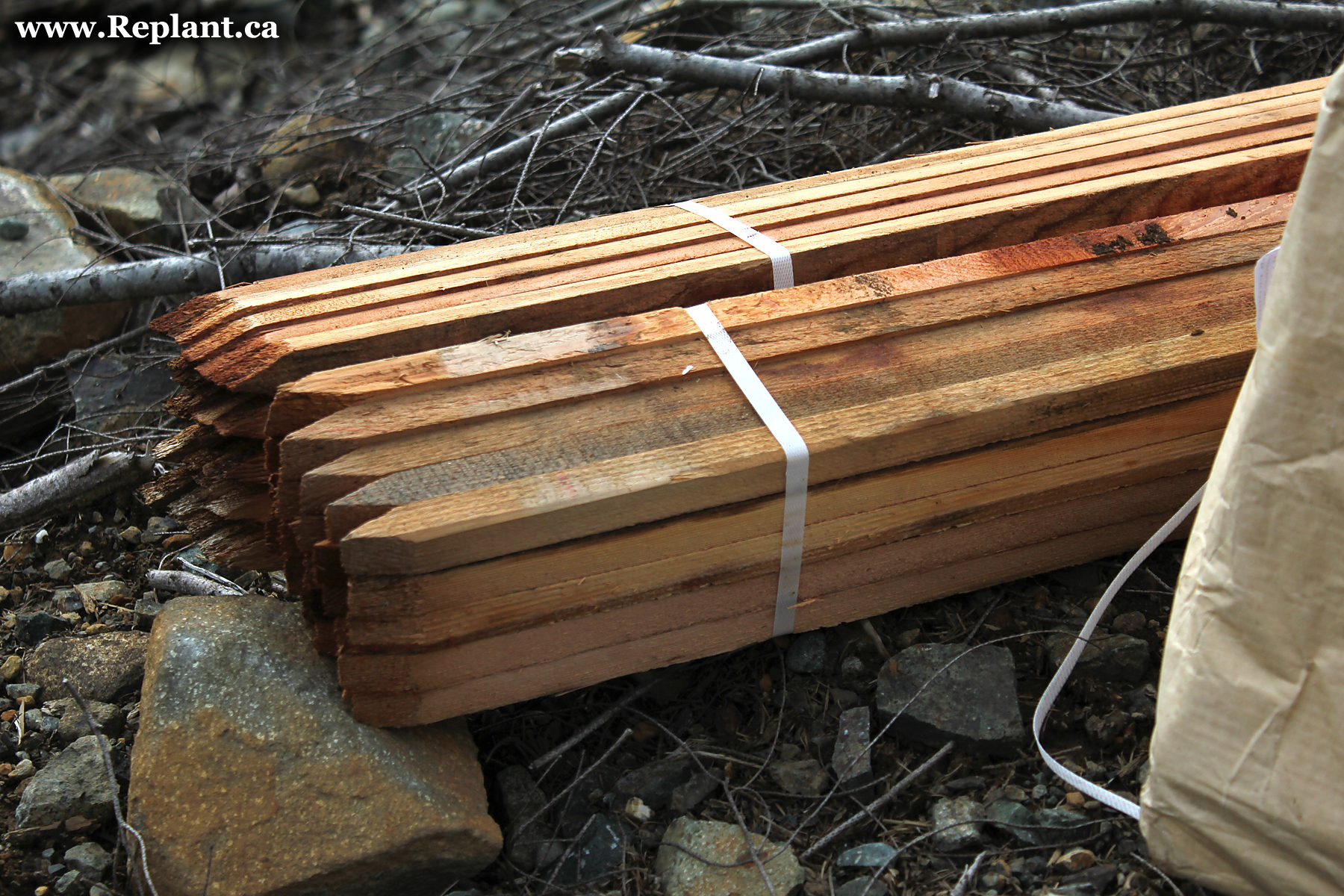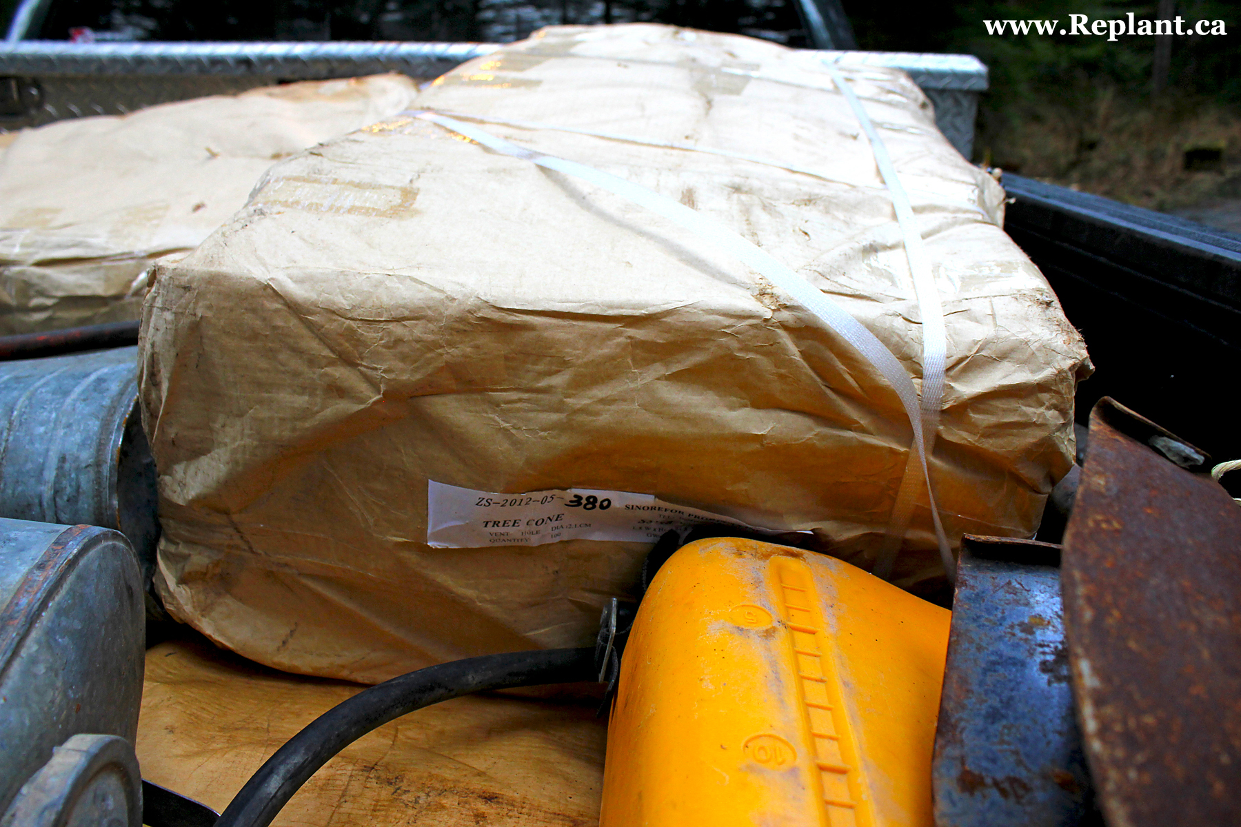 A package of cones. On some projects, we drive stakes into the ground beside the cedar seedlings, then strap cones over the seedlings, so the elk can't eat them. We saw elk on our blocks several times, looking for snacks.