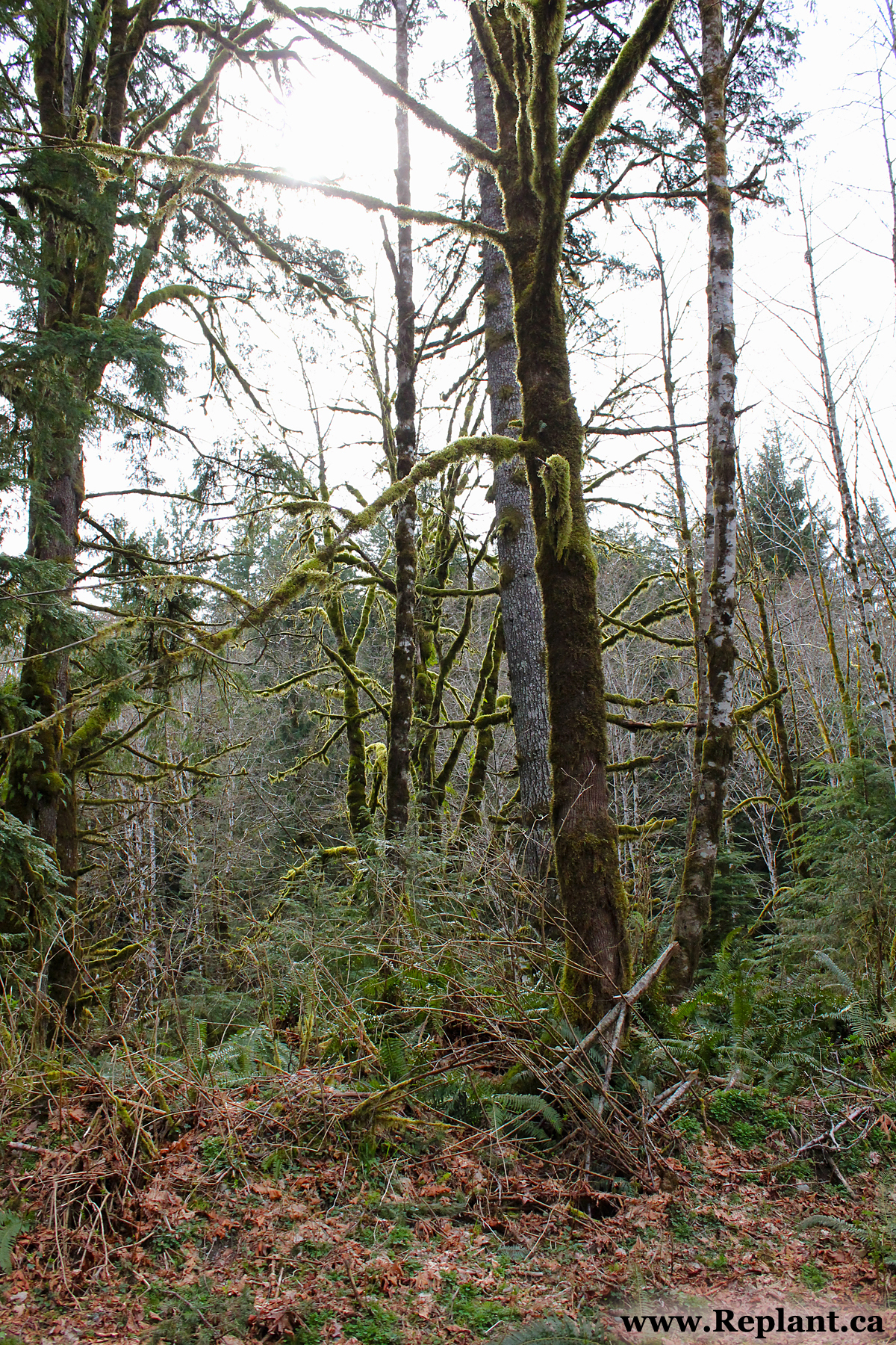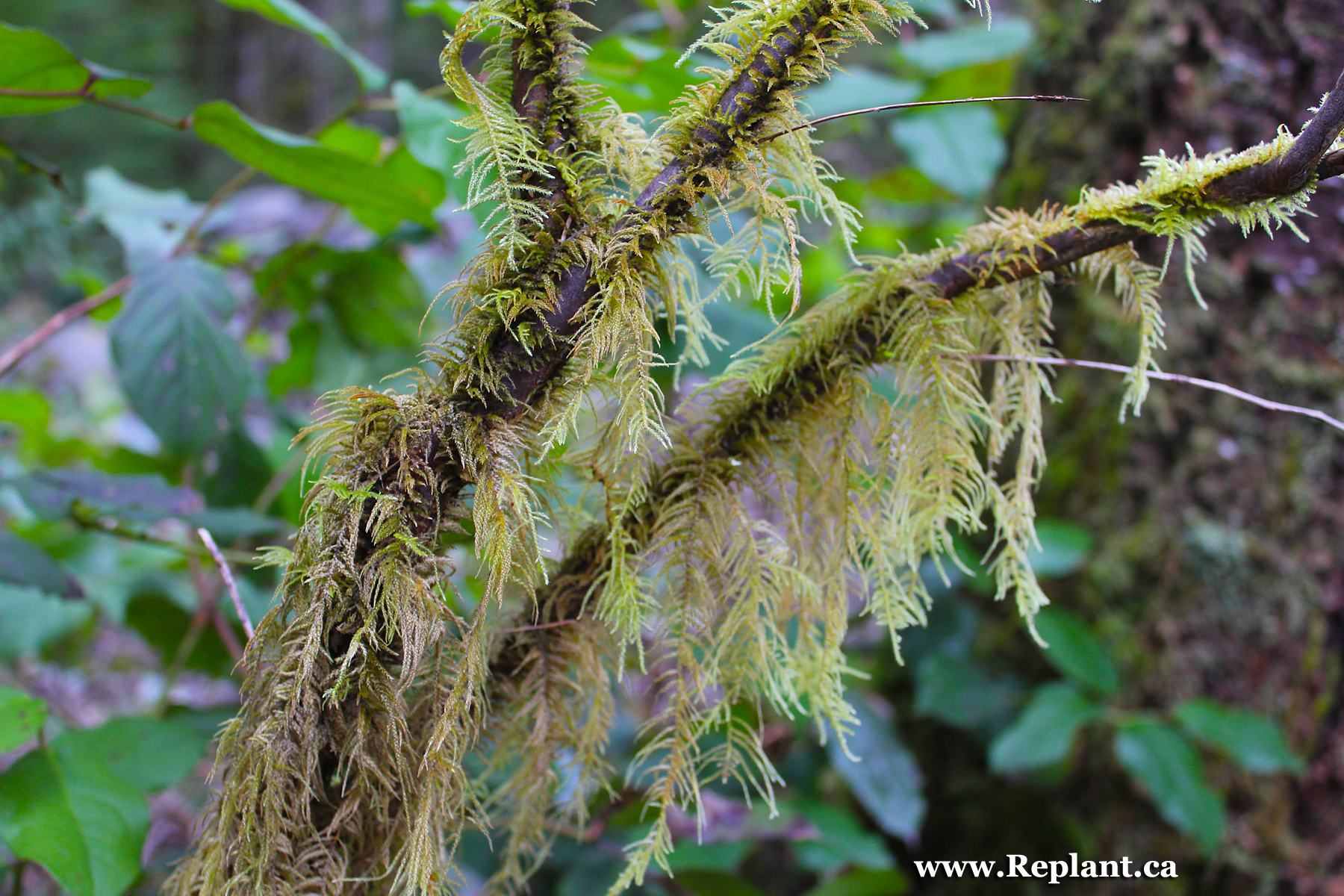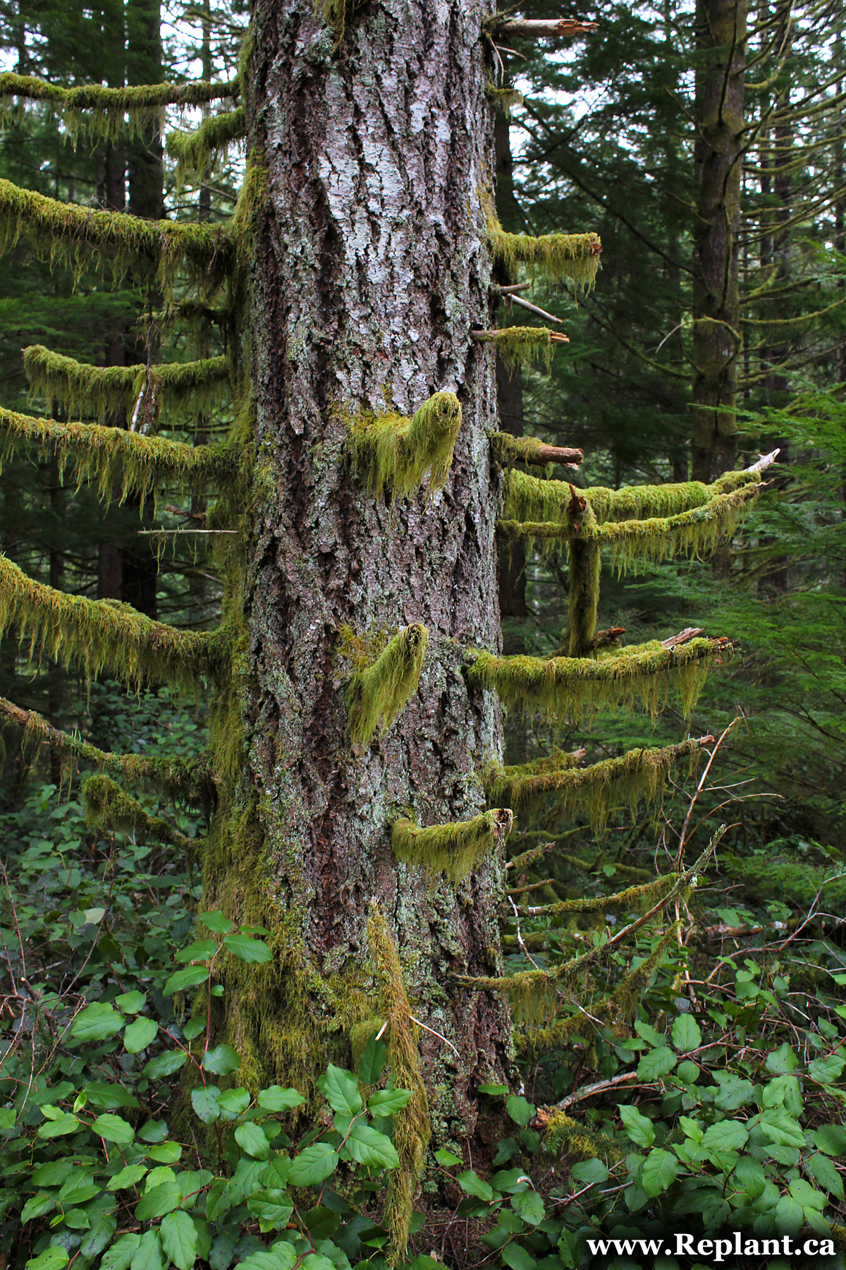 Most of the trees in uncut forests are covered with assorted types of moss or lichens.