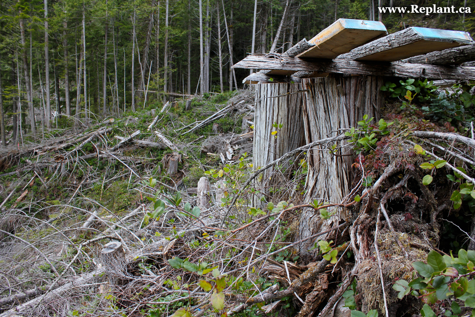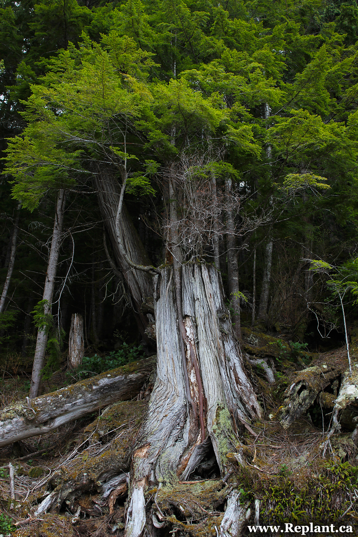 An old-growth stump. This old tree was probably harvested eighty years ago, as the block was harvested for second-growth trees. At the time it was cut, it was probably between four and eight hundred years old. It may have been growing before Columbus arrived in North America.